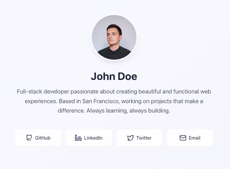 - Buttons or cards linking to my social media profiles (e.g. Twitter, LinkedIn, Instagram).
