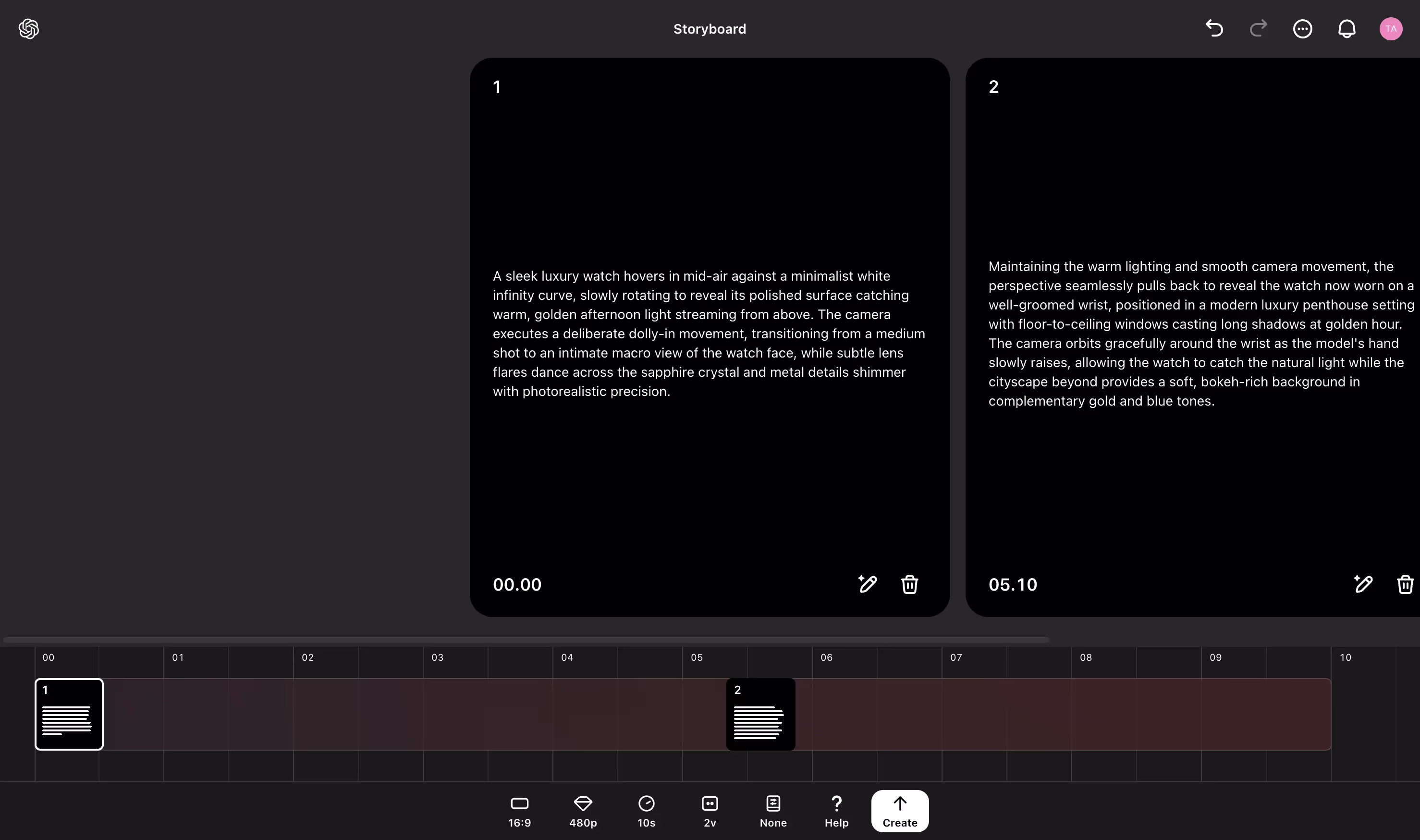 Enter the first scene prompt from Claude. The storyboard lets us place videos at specific timeframes, helping Sora create natural transitions between clips.