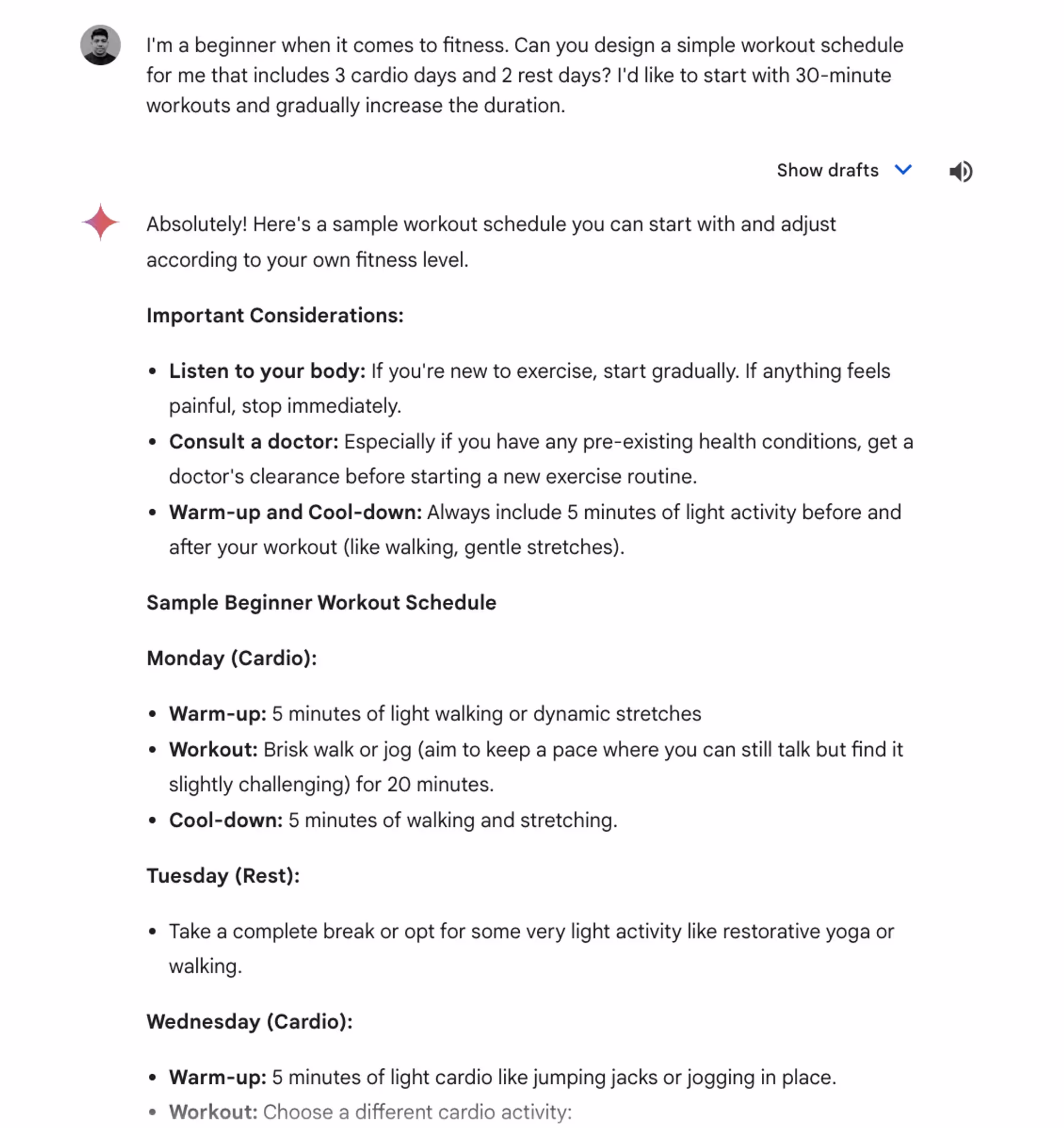 Thanks to its understanding language, Gemini can handle your custom requests and constraints, beyond templates and standard responses you usually find on the web.