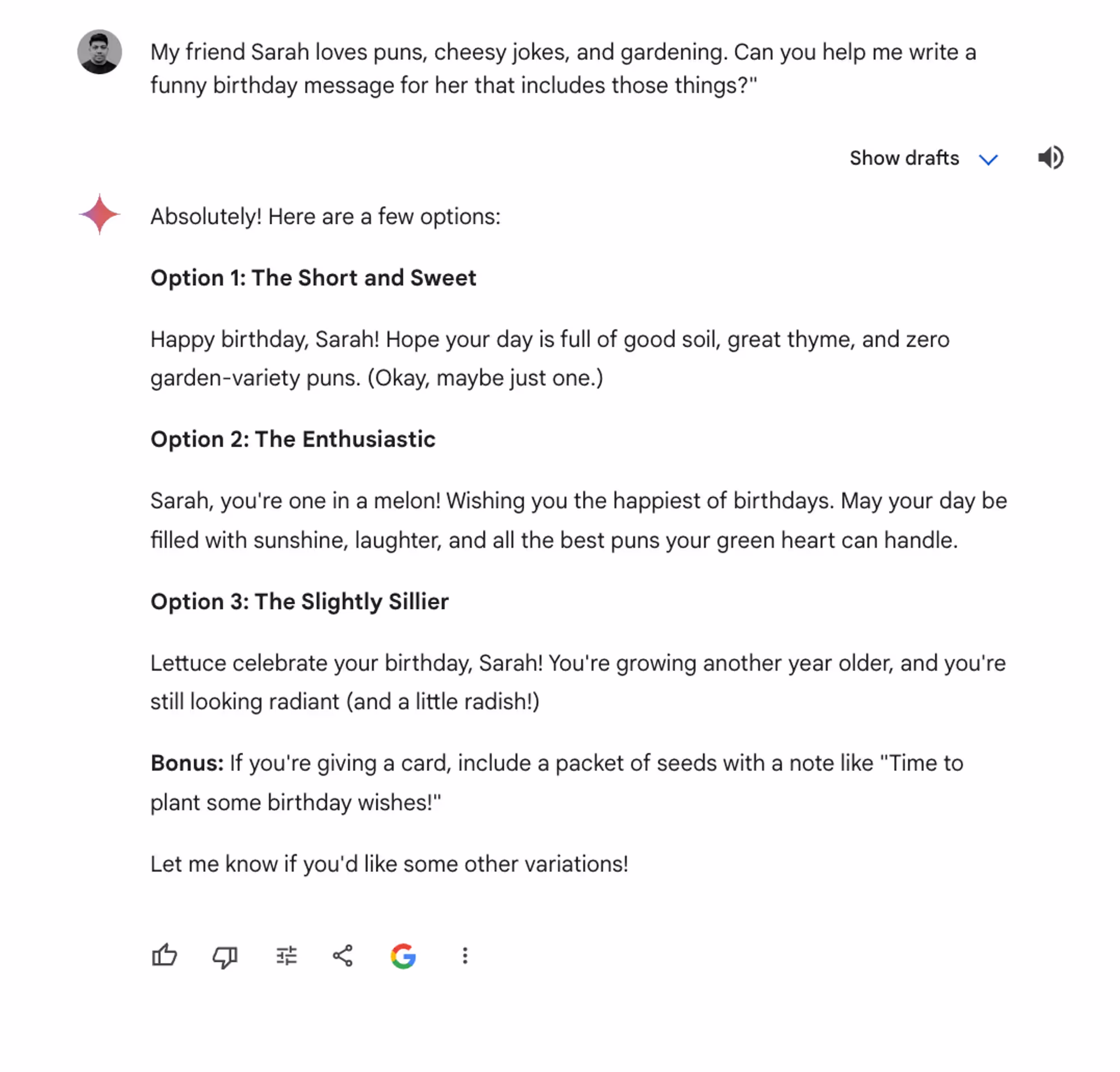 As we learned, Gemini is powered by an LLM, short for Large Language Model. It stands to reason then that it is great at writing. It can help you find the right words to craft thoughtful messages, be creative in your birthday wishes, or create entire stories from a single idea.