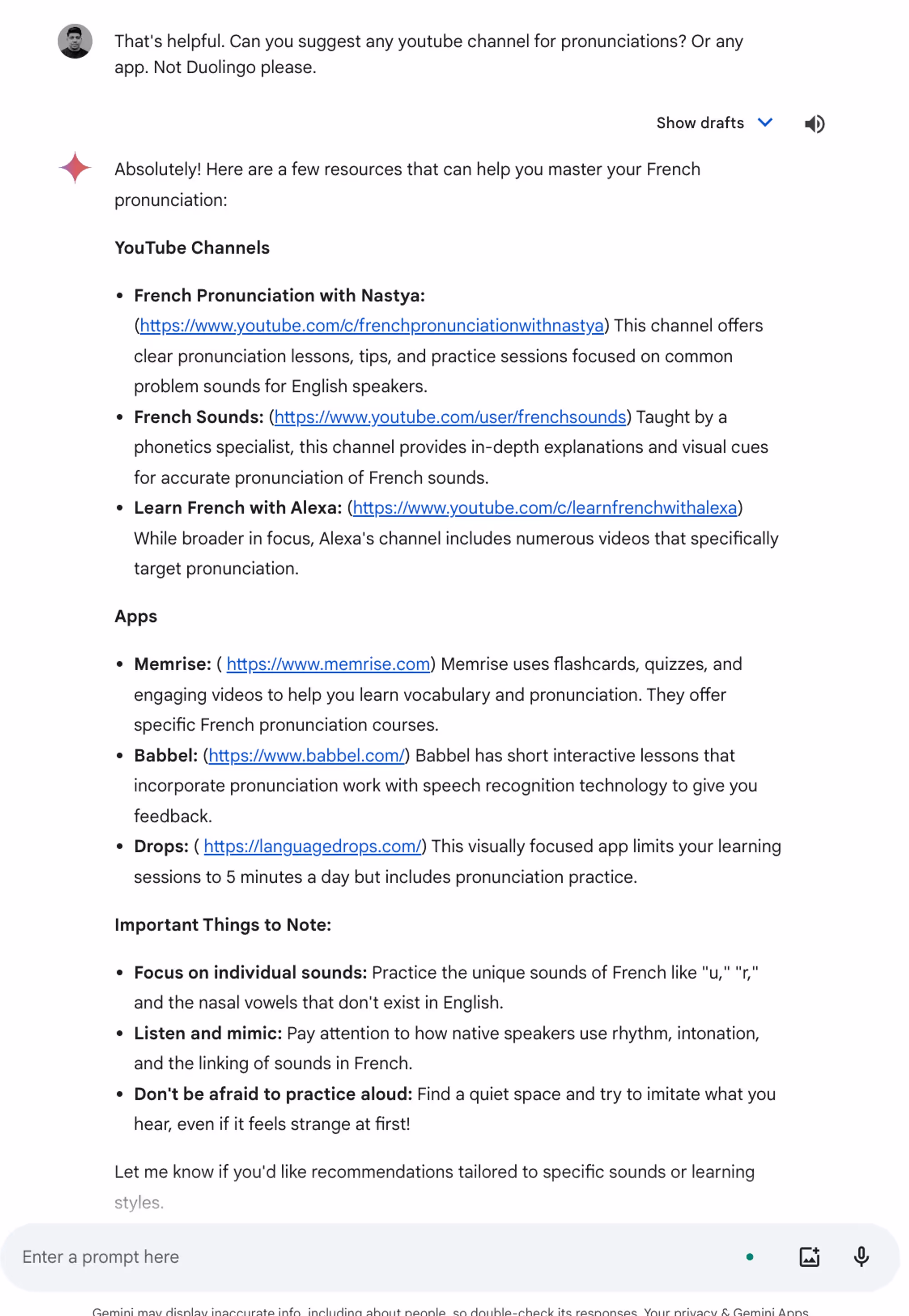 That's helpful. Can you suggest any youtube channel for pronunciations? Or any app. Not Duolingo please.