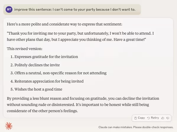 Since AI assistants like Claude are built for language, it stands to reason that writing is one of the most popular use-cases. You can ask for text to be generated, improved, or brainstormed.