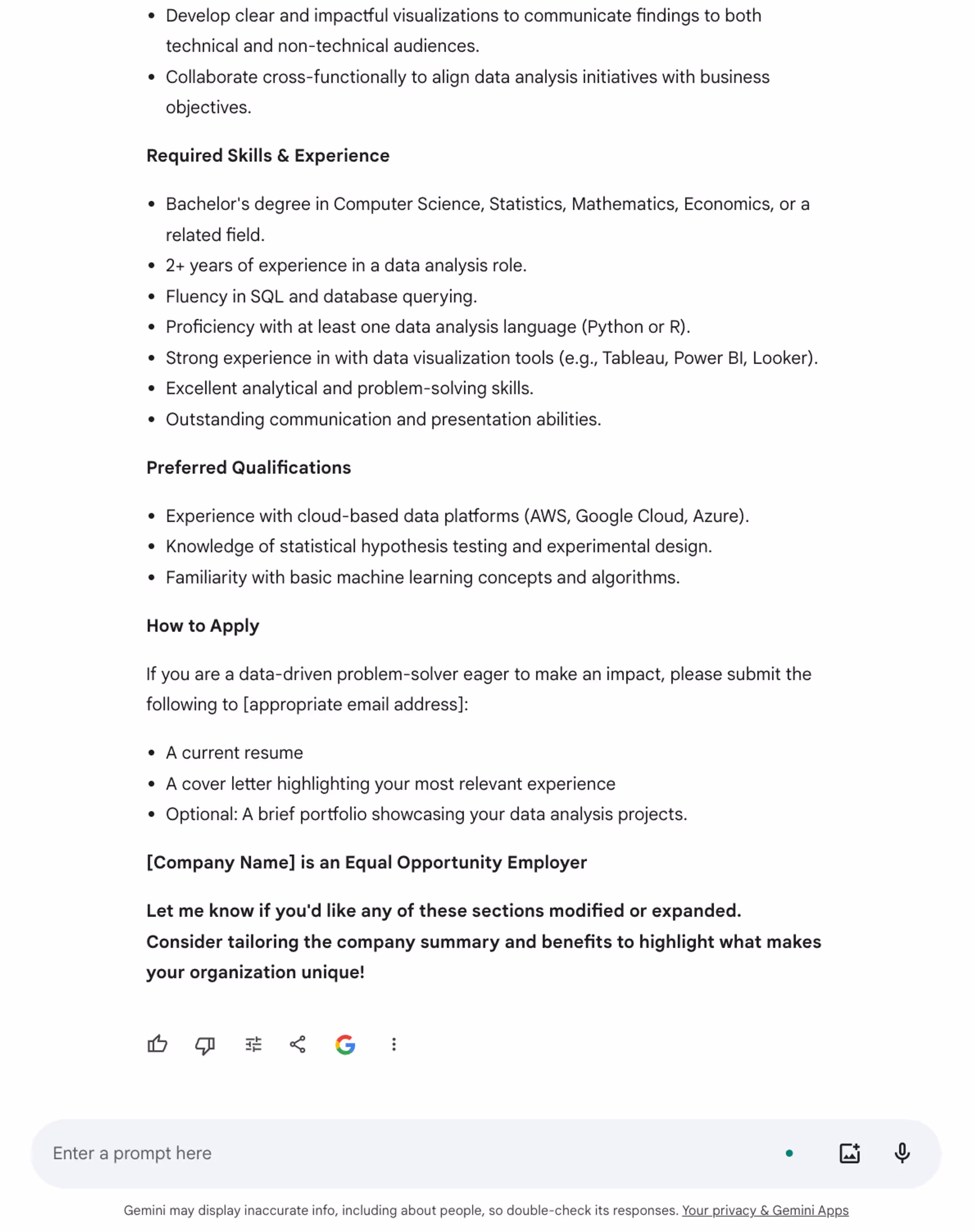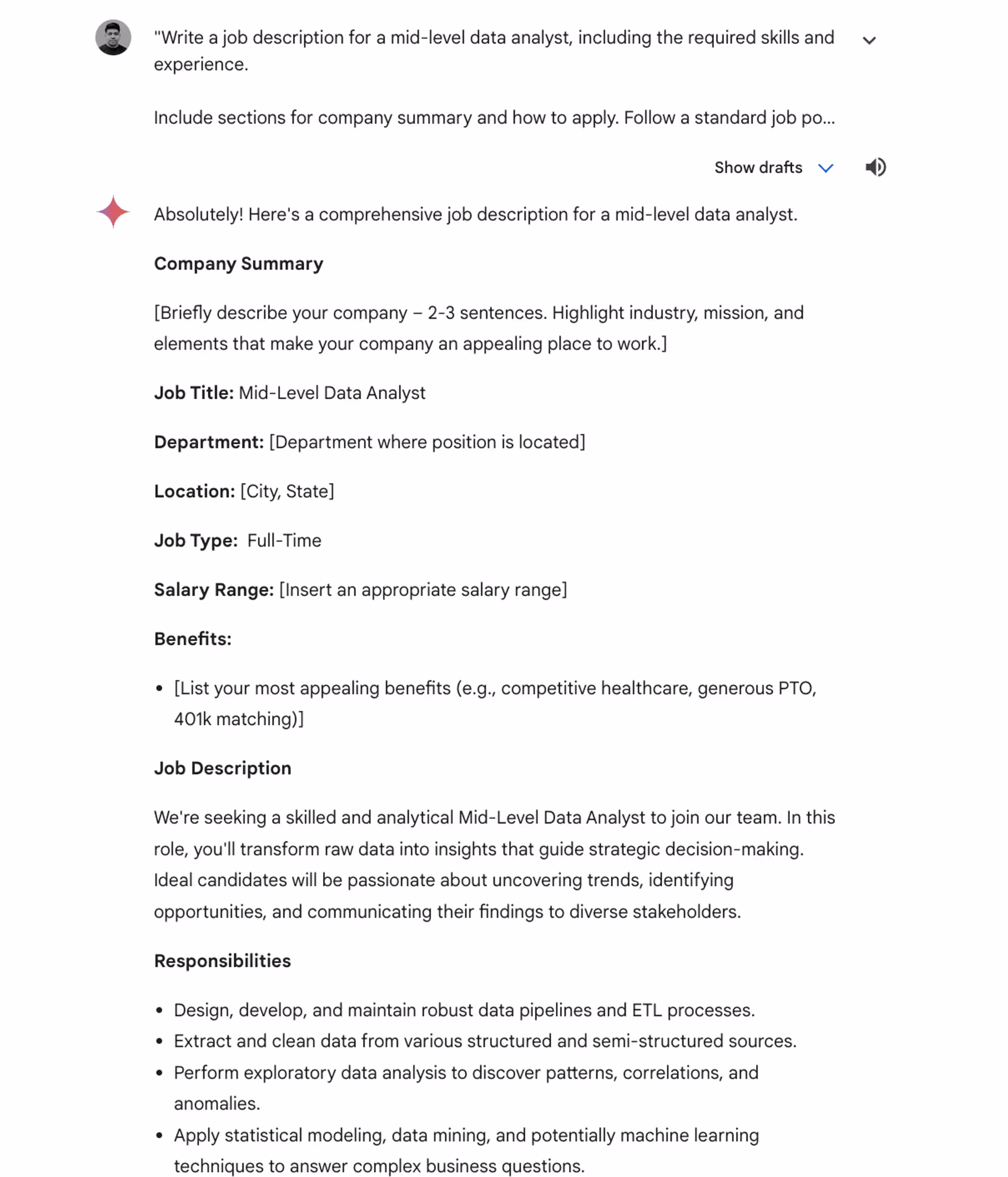 Job descriptions are the first point of contact for potential hires. They should both showcase your company's mission and set expectations for the role, while striking a balance between being informative and compelling. Gemini can lend a hand by suggesting language, highlighting key responsibilities, and even generating variations for different experience levels.