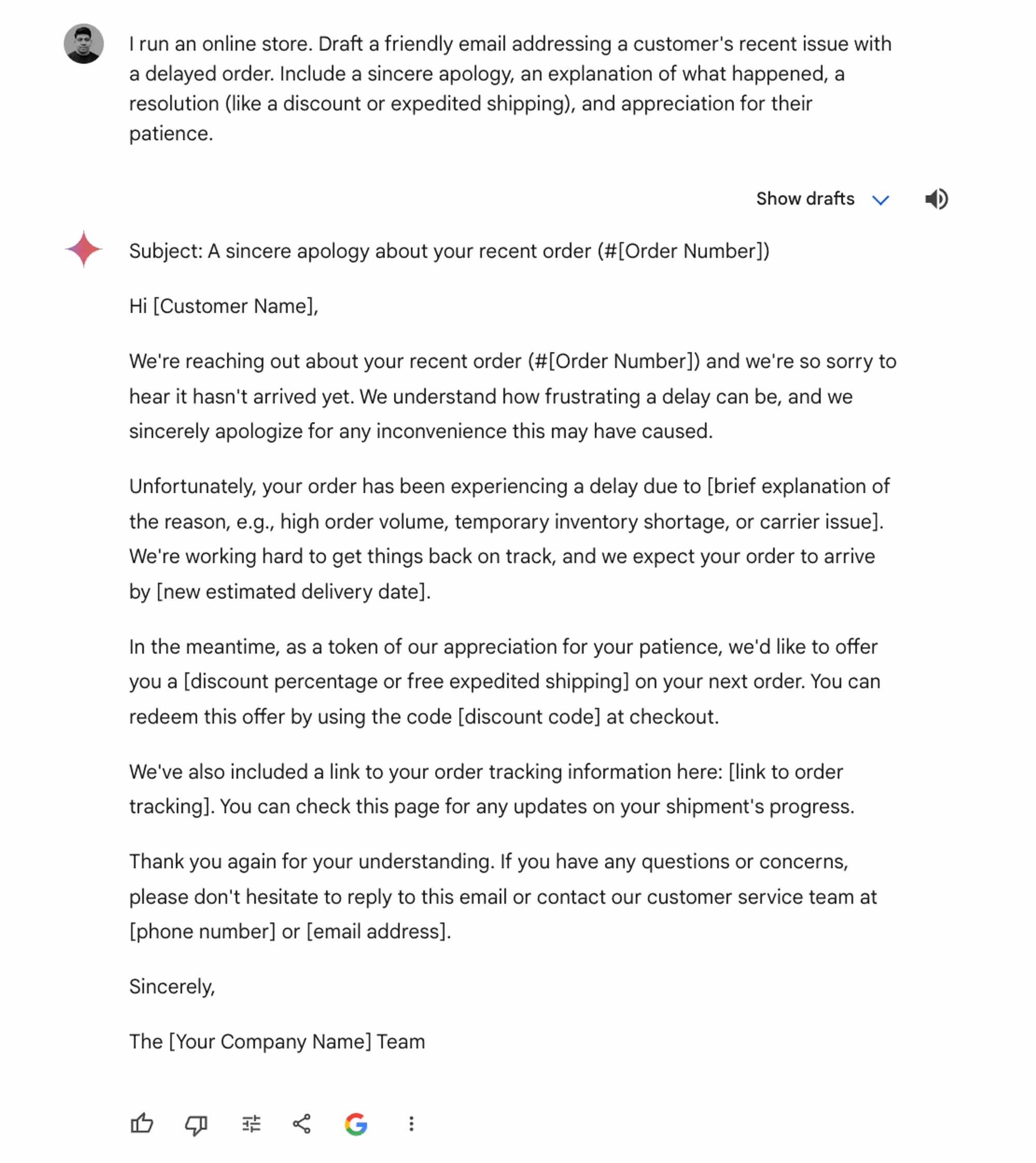 Let's consider a scenario where you need to address a customer's recent order delay—a common, but potentially frustrating experience that needs careful handling.