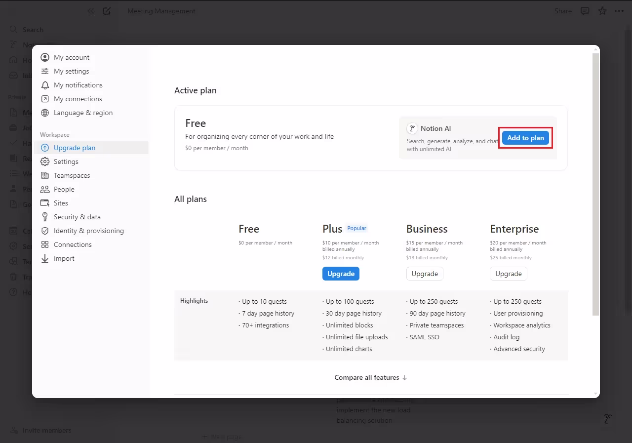 In the settings page, find the "Upgrade plan" tab. Click it to view the available plans. Here, you'll find an option to "Add to plan".