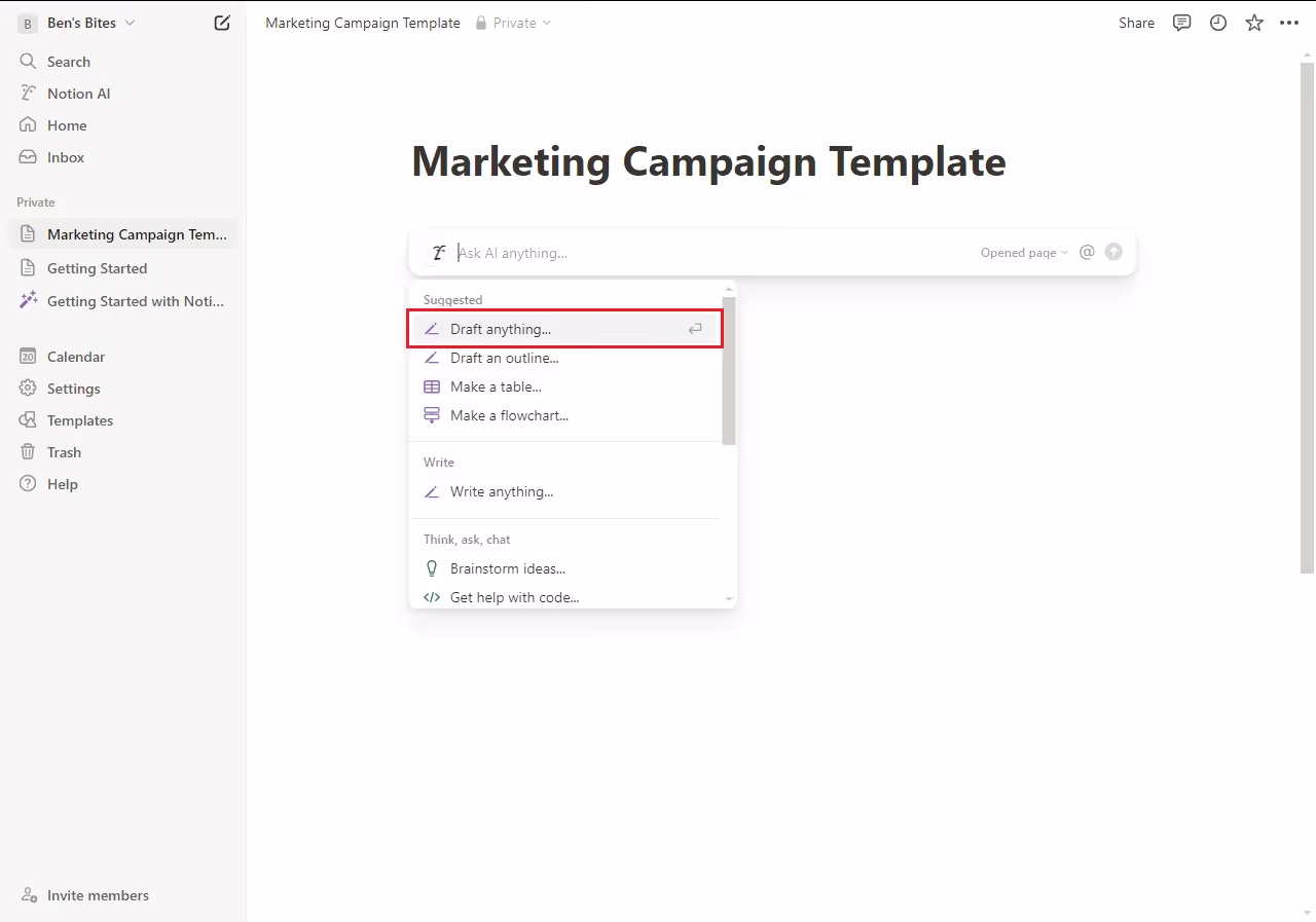 Open a new page in your workspace and type "/AI". From the 'See more options' menu, select 'Draft anything.'