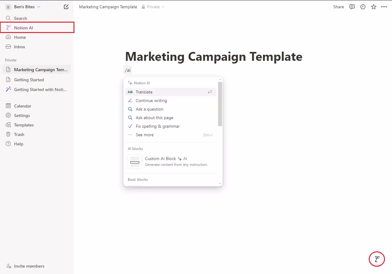 In-page AI commands: While working on a page, type "/" followed by "AI" to see a list of AI-powered actions. These include summarizing text, translating content, generating ideas, and more.