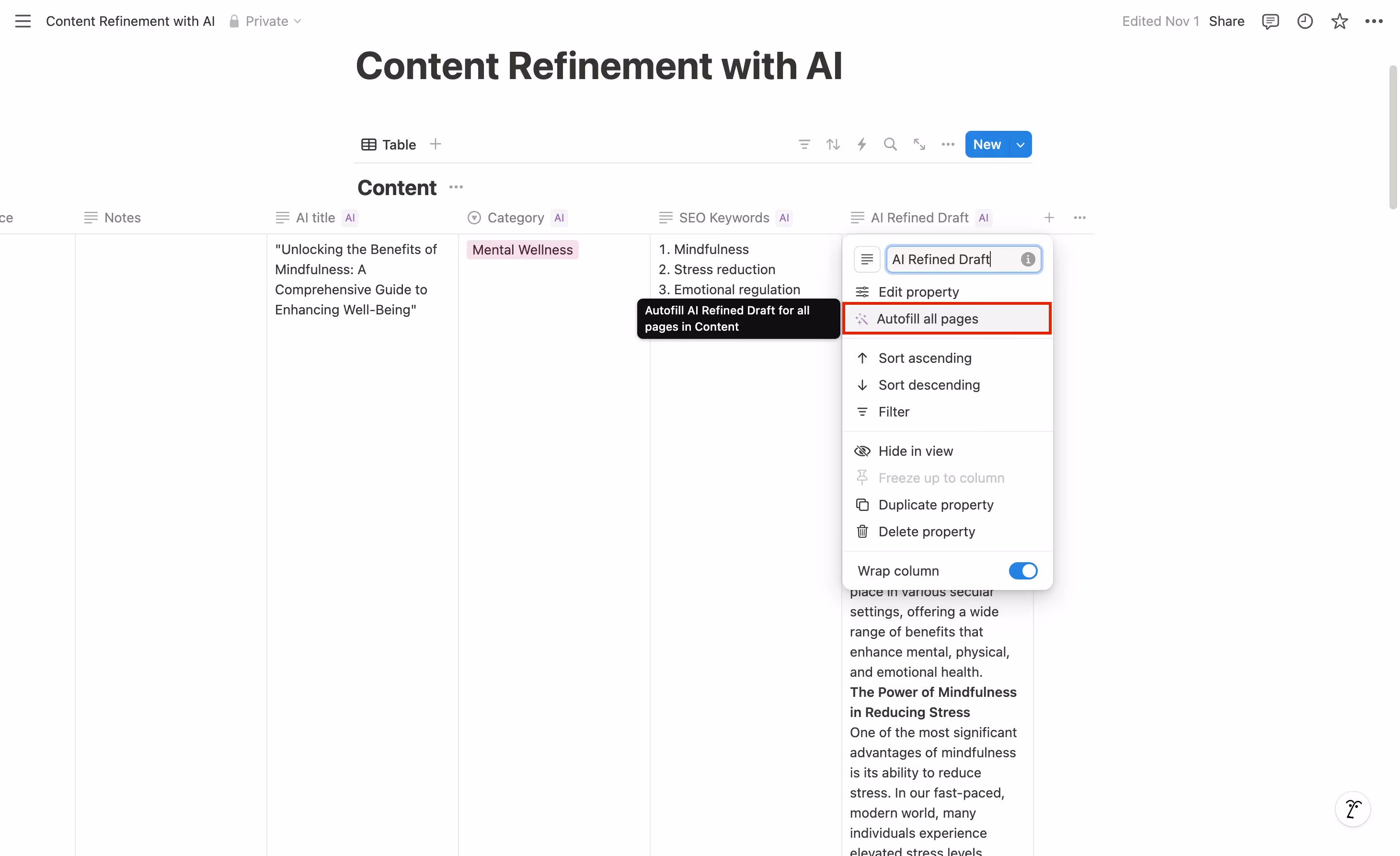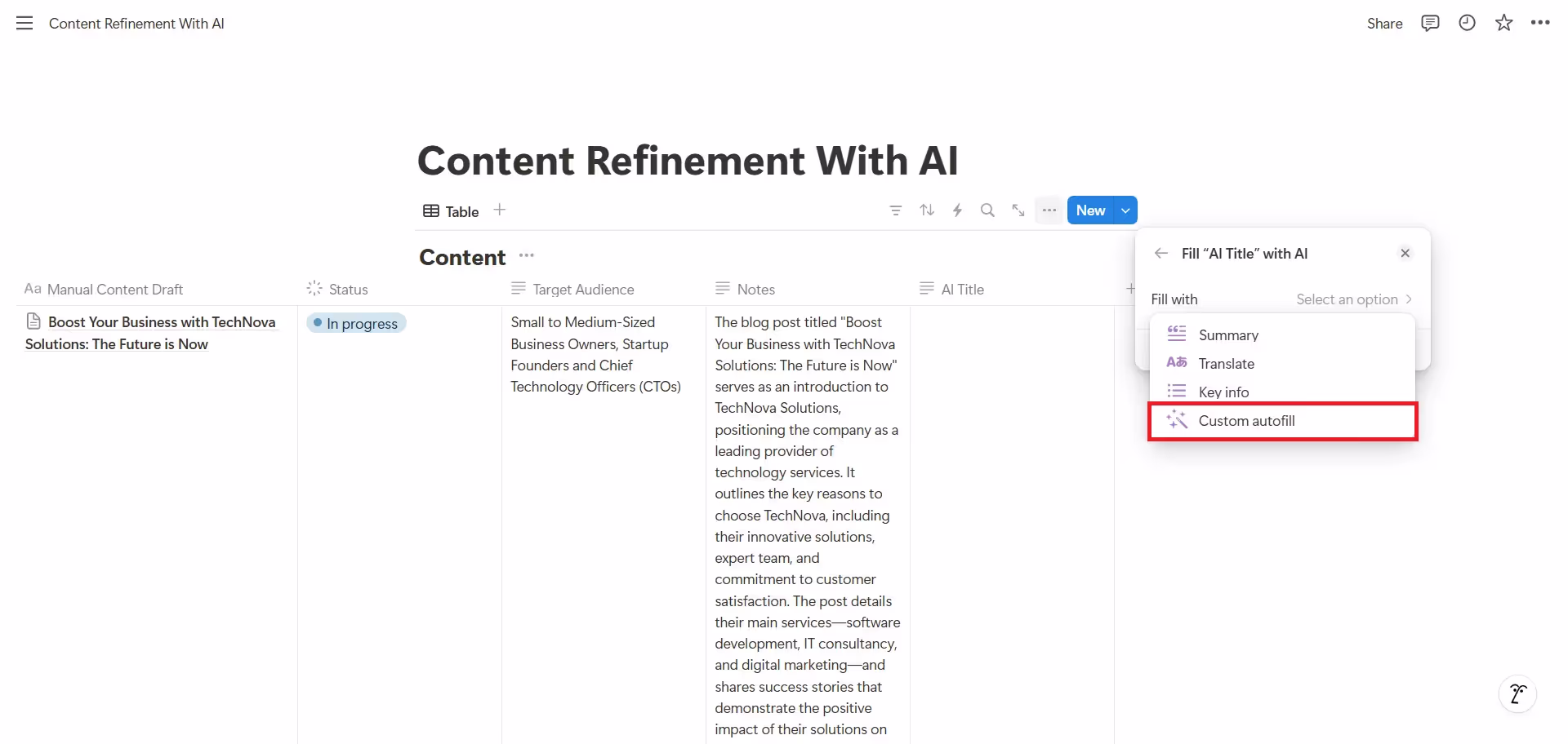 Finally, create the "AI Refined Draft" column using Custom Autofill. This is our masterpiece property that synthesizes all previous AI insights into a polished final version.