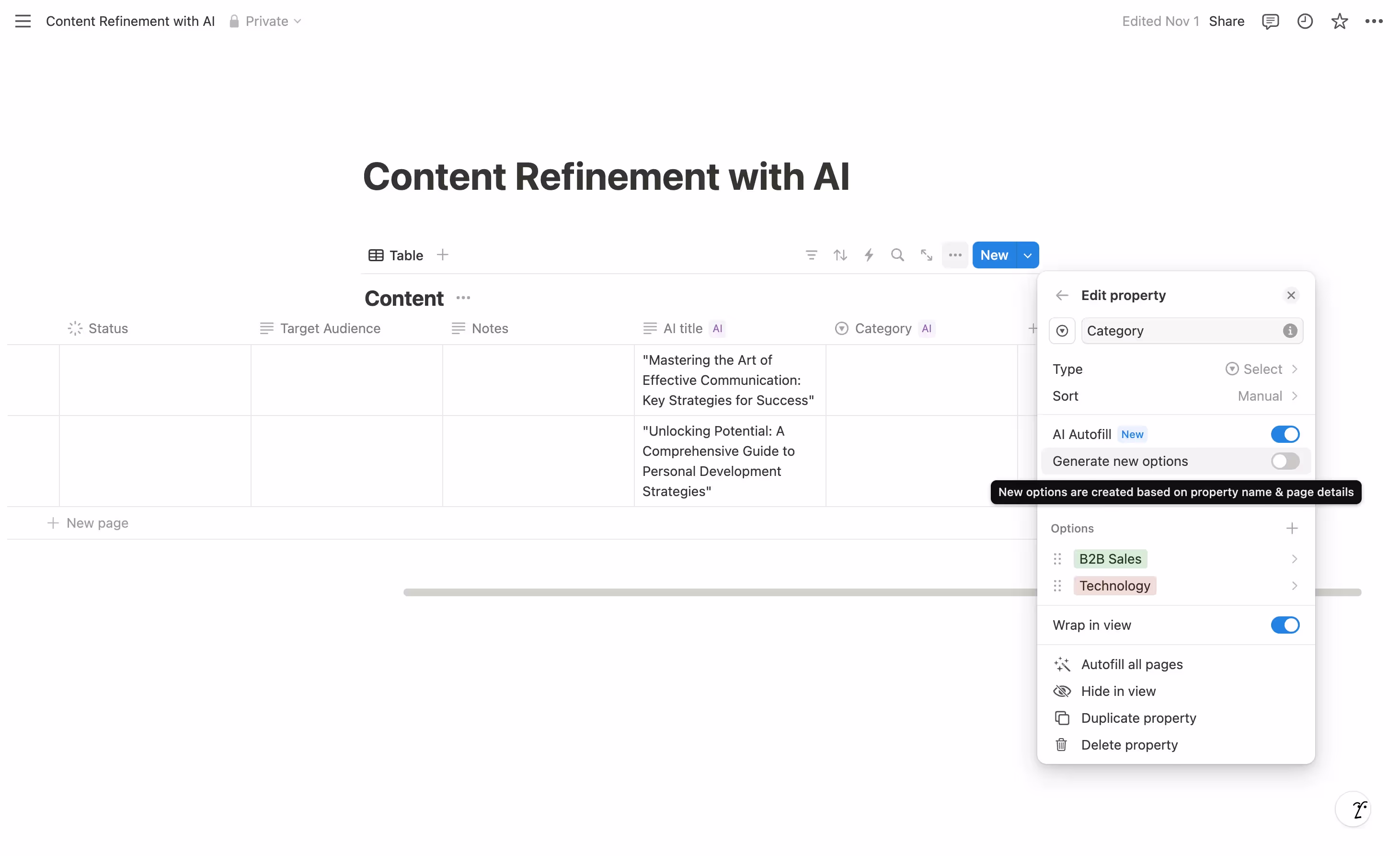 First, add some initial categories that make sense for your content. Then enable AI autofill and consider whether to toggle "Generate new options." This choice depends on your needs: