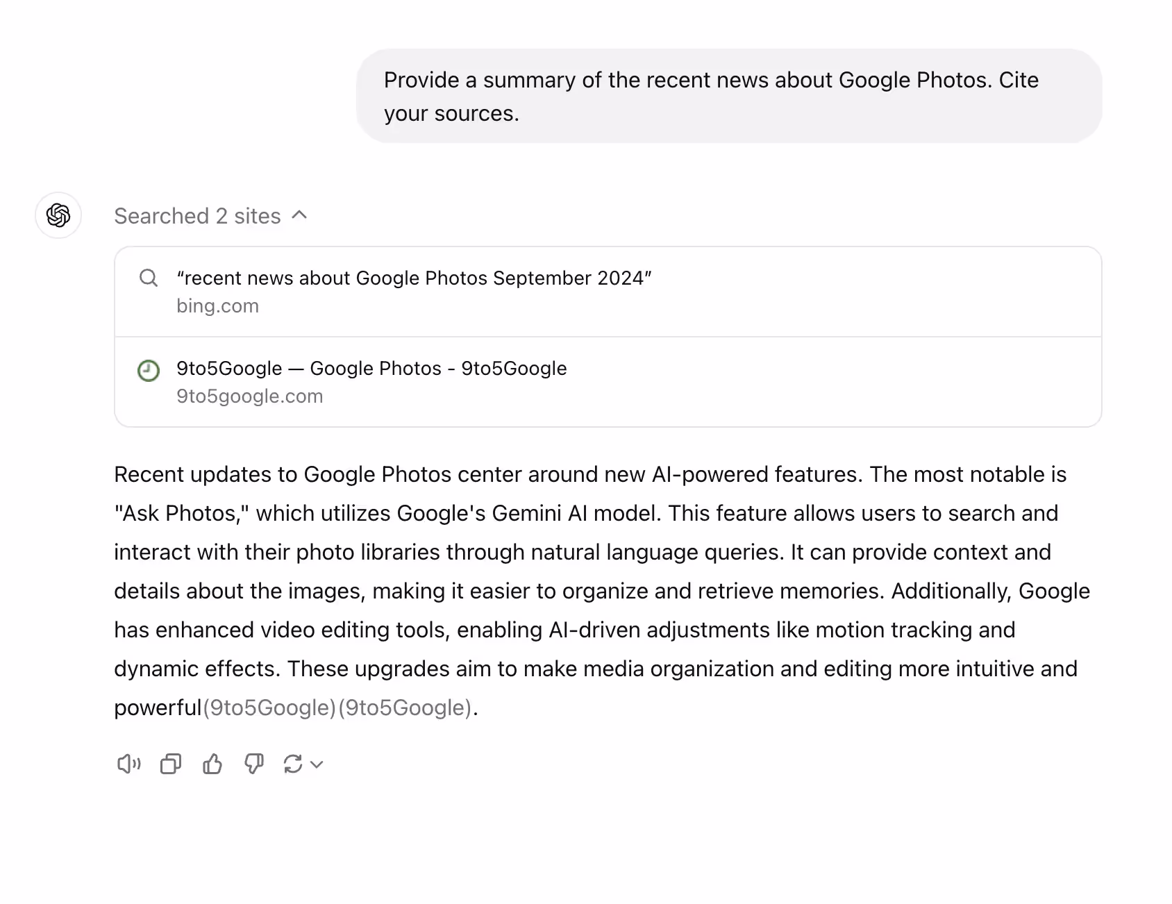 Let's summarise a TechCrunch article about Google AI-powered editing tools. I copied the text from the article and pasted it into ChatGPT with the following prompt: