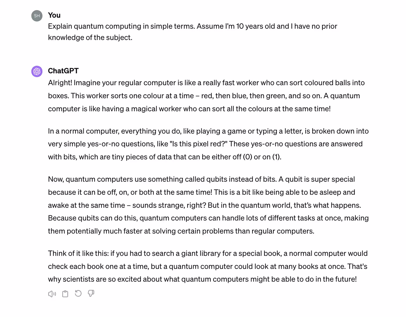 💡 Tip: Asking for explanations suited for a layperson or a child is a common way to get simplified explanations of complex topics.