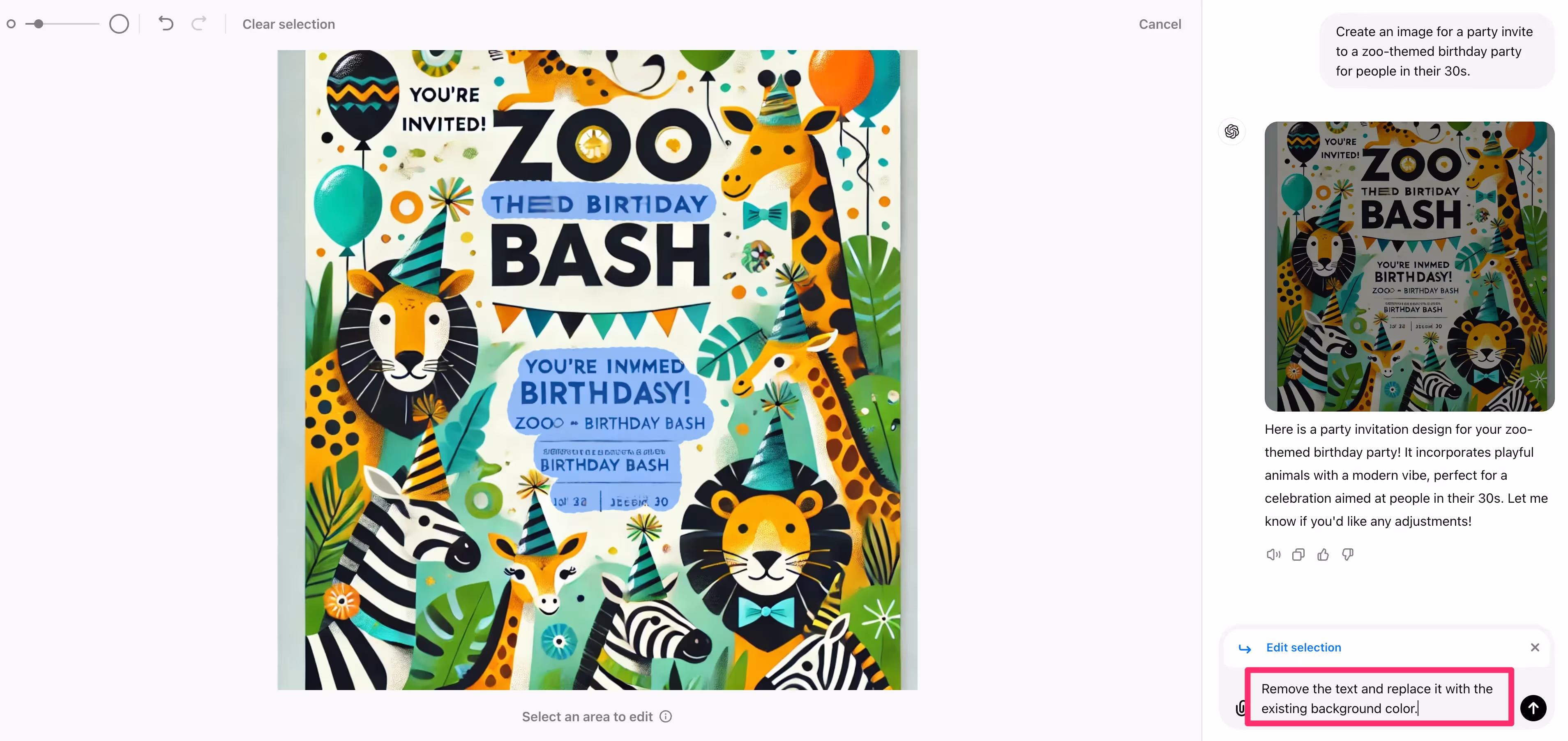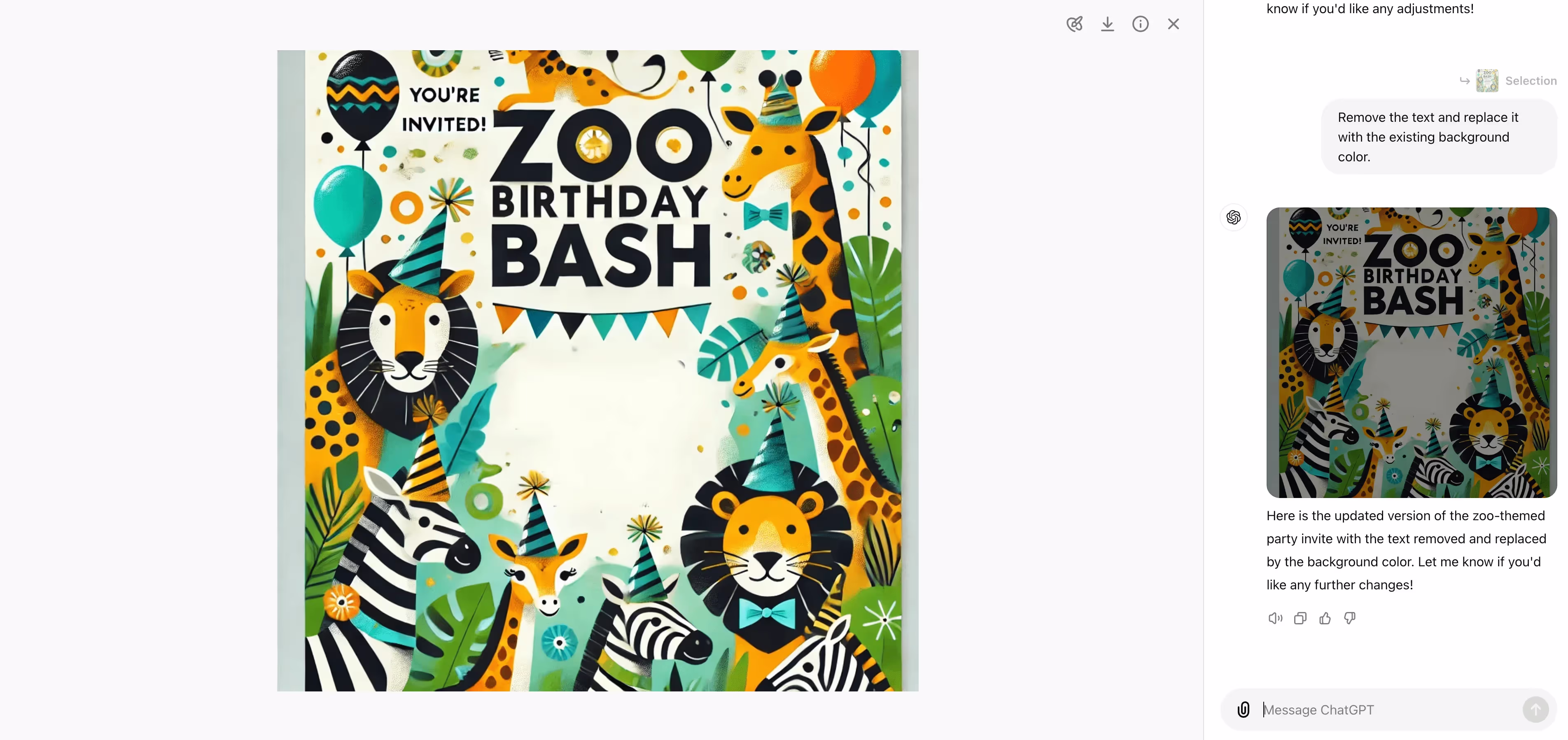 ChatGPT, with its DALL-E integration, can also generate images from your chat requests — without you having to leave the tool. For example, if we wanted to create an image for the zoo birthday party email invitation from earlier in this tutorial, we could simply ask ChatGPT to create an image.